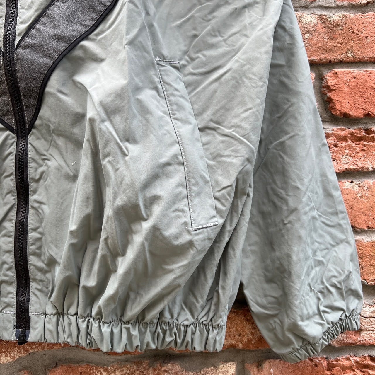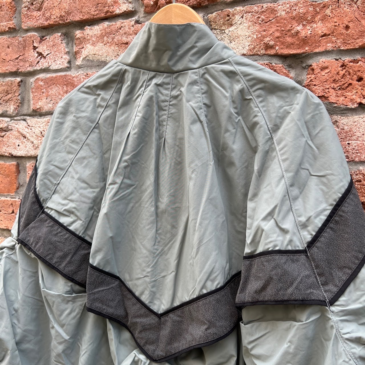 撥水性のあるグレーのナイロン生地で、前後にV字のリフレクター入り。